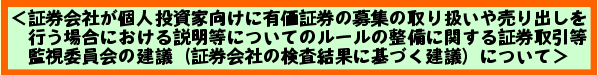 証券取引等監視委員会が行った証券会社に対する検査の結果、証券会社が個人投資家向けに社債を販売する際の営業姿勢に関して問題点が認められたことから、4月22日に同委員会から金融庁長官に対して、金融庁設置法第21条の規定に基づき以下の内容の建議が行われました。 最近実施した証券会社の検査において、証券会社が、社債の信用リスクに係る重要な情報の一つである発行会社の既発債の市場における流通利回りに大幅な上昇傾向が認められる状況において、この流通利回りの動向を適切に反映しない、投資家にとっては不利な条件で発行された新規社債について、この流通利回りの変化の状況を顧客に説明する等の措置を講じることなく、個人投資家向けに募集の取り扱いを行っている事例が認められました。 また、証券会社が他社株券償還特約付社債券(以下「EB」という。)への投資に影響を与える対象株式の株価が大幅に低下している状況において、対象株式の株価水準を適切に反映しない、投資家にとっては不利な発行条件で発行されるEBについて、対象株式の株価水準がEBに対する投資に与える影響を顧客に説明する等の措置を講じることなく、個人投資家向けに売り出しを行っている事例が認められました。 したがって、このような証券会社の営業姿勢を是正し、有価証券の投資に影響を与える市場要因が短期的に変化する場合、有価証券を募集、売り出しによって取得する個人投資家が情報面等で不利な状況となることを防止するために、証券会社が個人投資家向けに有価証券の募集の取り扱いや売り出しを行う場合における説明等についてのルールを整備する必要があります。 金融庁では、上記建議を踏まえ、必要なルール整備のための内閣府令改正案を作成し、5月9日(金)から金融庁のホームページにおいて、広く一般から意見を募るためのパブリックコメントに付しているところです。 |