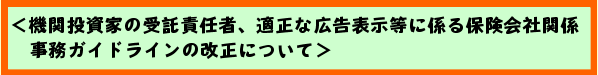 先般、「証券市場の改革促進プログラムの進捗状況」において、機関投資家の受託者責任の実効性を確保するため、特別勘定に係る保険会社の運用体制の充実等に関し、事務ガイドラインの見直しを行うとしたことを踏まえ、運用体制の整備など、特別勘定の運用について留意すべき事項を、保険会社関係に係る事務ガイドラインに追加いたしました。なお、信託銀行についても、預金取扱い金融機関関係に係る事務ガイドラインにおいて、同様の追加を行っております。 また、本年5月、公正取引委員会から、保険商品の広告表示等の中に、一般消費者に誤認を招くおそれのある表示があるとの調査結果が発表されたことを踏まえ、リーガルチェックを含めた審査体制の整備など、広告表示等の適正化を確保するために留意すべき事項を、保険会社関係に係る事務ガイドラインに追加いたしました。 |