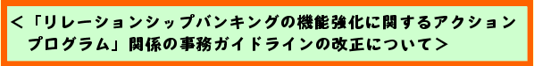 金融庁としては、各金融機関が今回の改正を積極的に活用することにより、リレーションシップバンキングの機能を持続的な形で強化していくことを期待しています。 |