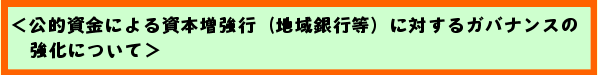 「リレーションシップバンキングの機能強化に関するアクションプログラム」(平成15年3月28日)及び「公的資金による資本増強行(主要行)に対するガバナンスの強化について」(平成15年4月4日。以下「ガバナンス強化ガイドライン」といいます。)を踏まえて、主要行以外の公的資金による資本増強行(地域銀行等)に対するガバナンスの強化については、リレーションシップバンキングの特性等を踏まえ以下の点に留意しつつ、「ガバナンス強化ガイドライン」を準用することとしました。(本ガイドラインは平成16年3月期から適用することとします。) |