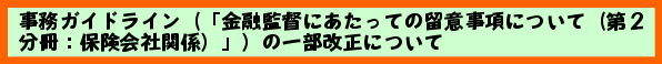 本文等をご覧になりたい方は、金融庁ホームページの「事務ガイドライン」から「事務ガイドラインの一部改正に関する報道発表」に入り、「第二分冊:保険会社関係」の「平成15年8月22日事務ガイドライン(「金融監督にあたっての留意事項について(第二分冊:保険会社関係)」)の一部改正について」及び「平成15年9月1日 事務ガイドライン(「金融監督にあたっての留意事項について(第二分冊:保険会社関係)」)の一部改正について」にアクセスしてください。 |