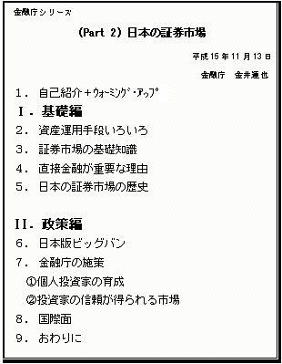 さて、調子の上がって来たところで本論です。ここで、先刻書いた「学生さん達全員にどうやって理解し満足してもらうか?」という一番大切な点、つまり、何処から話し始めるかを決めなければなりません。今回は、「TOPIX(東証株価指数)という株価の計算の仕方を知ってるかどうか、正直に手を挙げてくれるかい?」と聞いてみました。TOPIXというのは、東京証券取引所の一部上場株式の時価総額の指数で、証券市場を議論するには最も理論的な株価の指標である一方、日経平均に比べなじみが薄い指標であることも否めません。挙手の結果は知っている学生さんが1割弱。ということで、レジュメの基礎編を中心にやることにしました。 もう一つ、今回の筆者の講義の資料は、90分しゃべるために77ページ用意しました。いくつかの行政処分については、新聞発表の実物も用いました。1分間に1ページのペースで話さなければいけないことになりますが、そんな膨大な資料を作ったのは、「学生さん達に是非、金融庁が使うオリジナルの資料を見て、自分の意見を言って欲しい」と思ったからです。インターネットの時代、報道だけでなくオリジナルも見て、自分の意見を持ち、議論をしてもらいたい、議論を吹っかけてもらいたい、というのが講義の当日筆者が学生さんたちに最も言いたいことでした(意見が、金融庁にどんなに厳しくても、もちろん大歓迎です)。 |