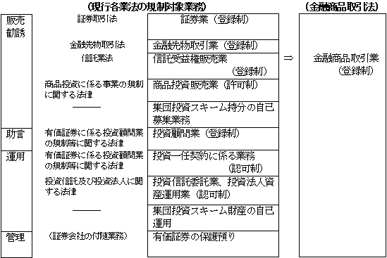 規制対象業務の横断化 現行の証取法は、有価証券・デリバティブ取引に関する「販売・勧誘」業務を「証券業」と位置づけ、基本的に登録制により規制しています。金商法では、現行の縦割り業法を見直し、現行の証券業のほか幅広い業務を「金融商品取引業」と位置付け、登録制により横断的に規制することとします(金商法2条8項、29条)。 |