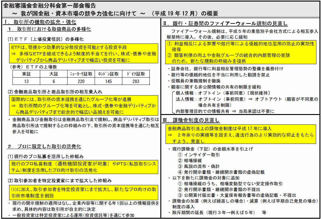 金融審議会第一部会では、金融審議会「我が国金融・資本市場の国際化に関するスタディグループ」の中間論点整理(平成19年6月13日)等を踏まえ、我が国市場の競争力の強化を図るとの観点から、