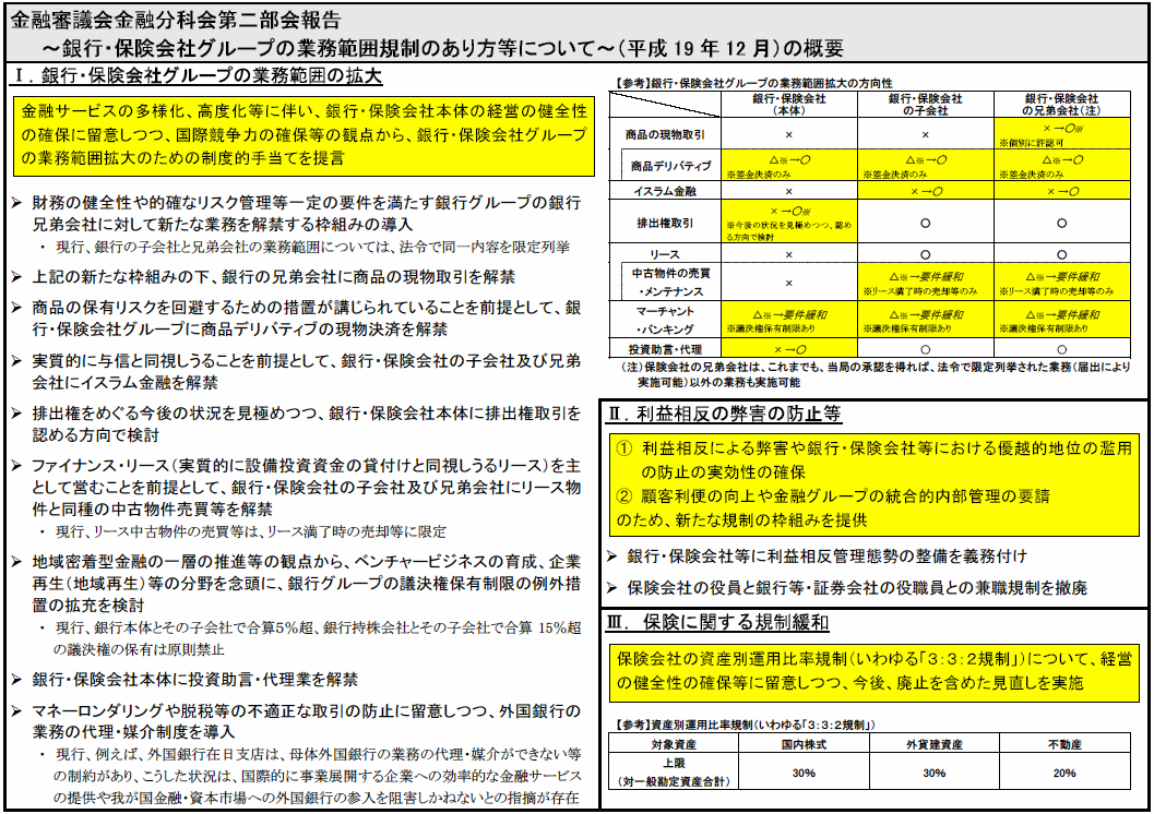 その審議の結果を踏まえ、同年12月18日、「金融審議会金融分科会第二部会報告~銀行・保険会社グループの業務範囲規制のあり方等について~」がとりまとめられました。