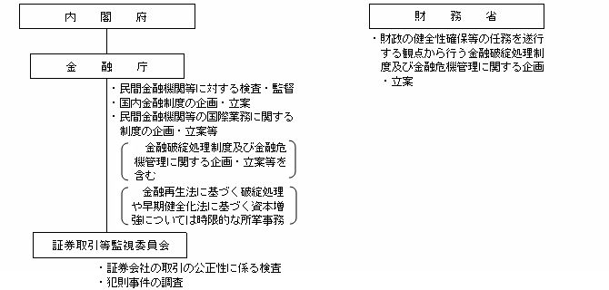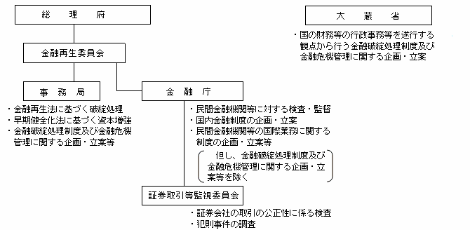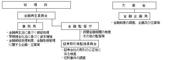ホーム 金融庁について 金融庁の概要 金融行政機構の推移 Tweet 金融行政機構の推移 【平成4年7月から平成10年6月】 【平成10年6月から平成10年12月】 【平成10年12月から平成12年6月】 【平成12年7月から平成13年1月】 【平成13年1月から平成16年3月】 【現 行】 サイトマップ 金融庁についてページ一覧を開きます 組織 大臣・副大臣・政務官 金融庁の概要 金融庁の改革 所管の法人 予算・決算 政策評価 採用情報 報道・広報ページ一覧を開きます 報道対応 報道発表資料 記者会見 大臣談話等 広報活動 アクセスFSA(広報誌) 白書・年次報告 職員による講演等 職員による寄稿等 利用者の方へ 注意喚起情報 業界団体との意見交換会において金融庁が提起した主な論点 よく閲覧されているページ 政策・審議会ページ一覧を開きます 基本方針等 金融行政方針 政府方針における金融庁関連の施策 政策テーマ・施策 政策テーマ等一覧(金融行政方針との関連) 政策テーマ等一覧(全体) 審議会・研究会等 審議会・研究会等一覧 研究・調査 金融研究センター 法令・指針等ページ一覧を開きます 所管法令等 検査・監督の基本方針等 基本方針・ディスカッションペーパー一覧 監督指針・事務ガイドライン 監督指針一覧 事務ガイドライン(第三分冊:金融会社関係)一覧 告示・ガイドライン・Q&A等 告示・ガイドライン・Q&A・法令解釈事例集一覧 金融上の行政処分等 金融機関情報ページ一覧を開きます 全金融機関共通 預金取扱金融機関(銀行等)関連 保険会社関連 金融商品取引業者等関連 金融会社関連 国際関係情報ページ一覧を開きます 国際関係の取組み 国際金融センター 金融庁グローバル金融連携センター(GLOPAC) 監査監督機関国際フォーラム(IFIAR)事務局への活動支援 国際基準設定主体等の公表資料等 金融安定理事会(FSB) バーゼル銀行監督委員会(BCBS) 保険監督者国際機構(IAIS) 証券監督者国際機構(IOSCO) 金融活動作業部会(FATF) その他 アクセスFSA(広報誌) ページの先頭に戻る