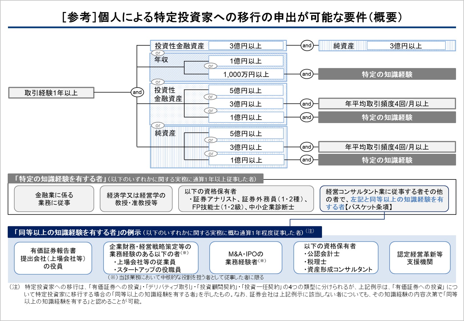 また、以下4-1~4-4に該当しない個人についても、その知識及び経験の実態に応じて、申出を受けた金融商品取引業者等において「同等以上の知識及び経験を有するもの」に該当すると判断することは可能です。
