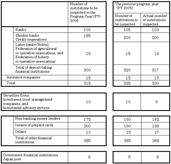 For PY 2006, the FSA will carry out its inspections in both proper and effective manners to ensure the soundness and the properness of the management of the financial institutions, while paying attention to the change of the environment surrounding them, such as growing need for customer protection and the implementation of New Basel Capital Accord (the new capital adequacy framework).