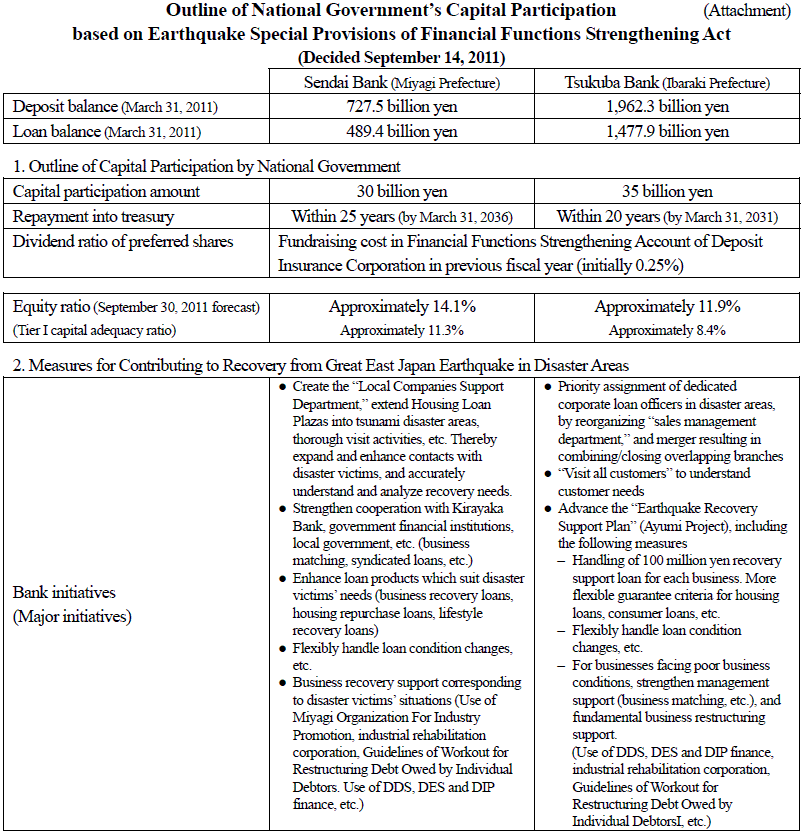 Based on special provisions for financial institutions affected by the Great East Japan Earthquake of the “Act on Special Measures for Strengthening Financial Functions” (hereinafter referred to as the “Financial Functions Strengthening Act”), the national government decided on September 14 to take capital participation in Sendai Bank and Tsukuba Bank. An outline of this capital participation is explained below.