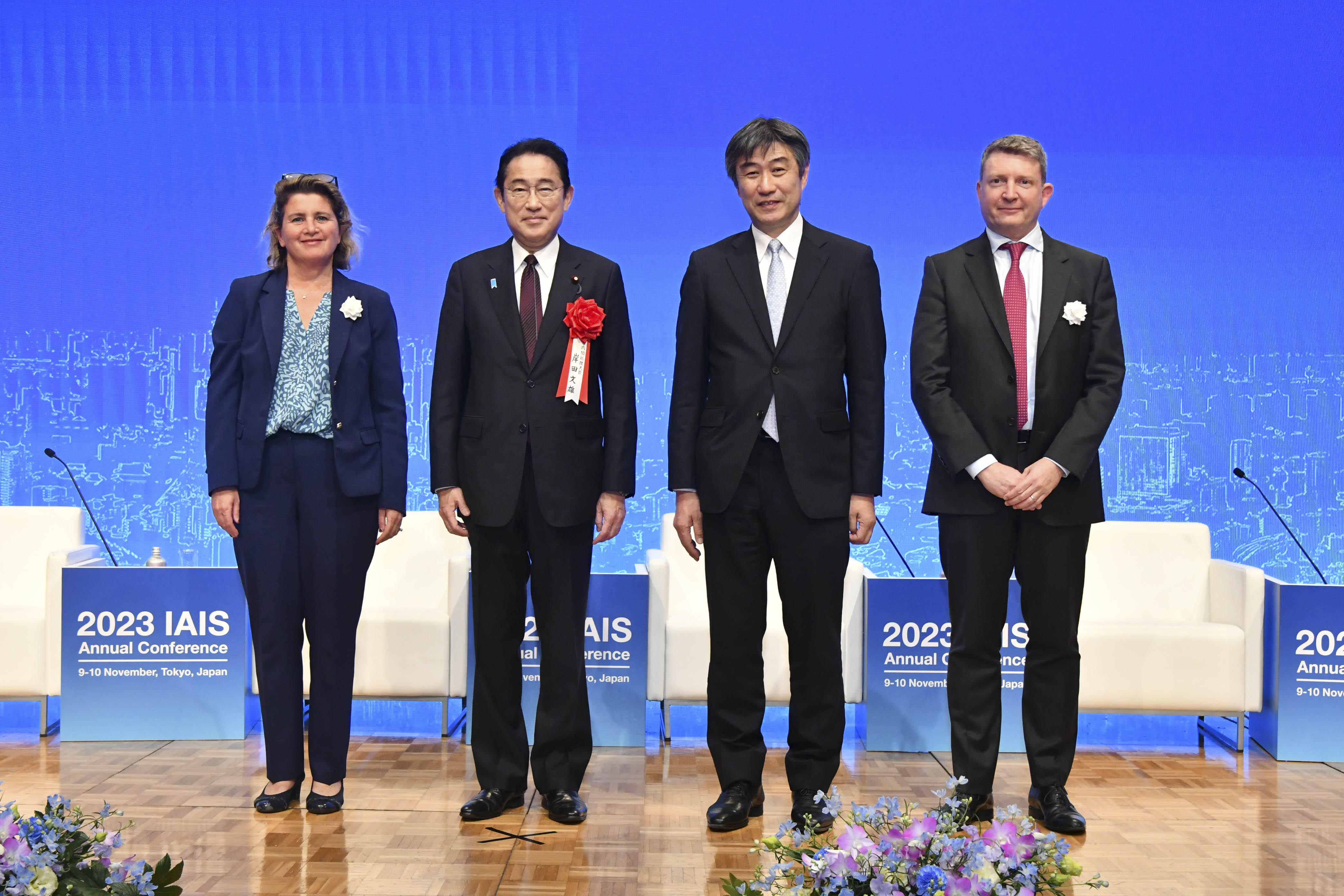 (右:記念撮影 左からVictoria Saporta IAIS執行委員会前議長、岸田総理大臣、有泉金融国際審議官(IAIS執行委員会新議長)、Jonathan Dixon IAIS事務局長)