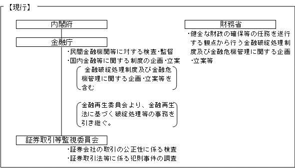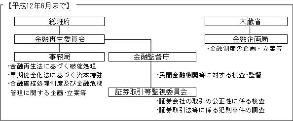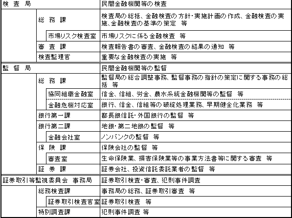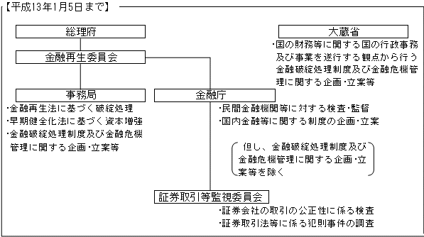 金融庁は、昨年7月1日に、全体の中央省庁再編に先行して、金融再生委員会に置かれていた金融監督庁と大蔵省金融企画局を統合して設立されましたが、本年1月6日の中央省庁再編に当たって、改めて内閣府の外局として設置されるとともに、金融再生委員会の廃止に伴い、同委員会が担っていた破綻処理等の事務を承継することとなりました。これにより、金融庁は、金融制度の企画立案から検査、監督、監視の実施機能までを一貫して担うとともに、銀行、保険及び証券等の分野を横断的に所管し、金融行政を一元的に遂行することになりました。 また、今般の中央省庁再編に伴い、機構面では、内閣機能強化の観点から内閣府に新設された特命担当大臣が金融庁の所管事項について設置されるとともに、金融行政の重要性に鑑み、これまでの総務企画部、検査部及び監督部の3部体制が、総務企画局、検査局及び監督局の3局体制に強化されることになりました。 なお、金融再生委員会が担ってきた破綻処理や資本増強に係る事務に関しては、監督局総務課に金融危機対応室及び監督企画官を新設し、業務執行体制を整備しました。 さらに、資本増強・破綻処理に係る基本的問題及び個別案件のうち特に重要なものに関しては、従来金融再生委員として多大な貢献をされてきた方々の御意見を伺い、その意見を金融行政に適切に反映させるため金融庁顧問会議を設置しています。 | |||||||||
