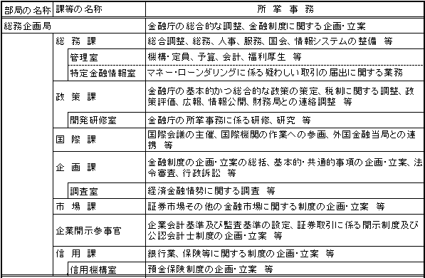 .機構・定員 機構面では、金融行政の専門性・先見性向上のため「研究開発室」等を新設することとし、定員面では、時限定員21人の恒久化を含め110人の増員を図り体制を整備することとしています。各部局別の体制整備の概要は以下のとおりです。 |