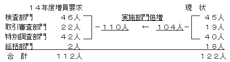 .機構定員要求の内容 平成14年度機構定員要求では、上記のような基本的考え方に基づき、全体で250人の増員等を行うこととしている。要求内容を各部局別に整理すると、以下のとおり。 |
