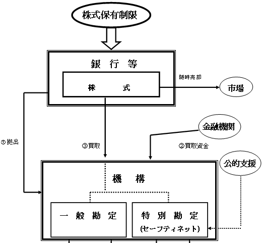 .法律の目的 この法律の目的は、第一に、我が国の銀行等が相当程度の株式を保有しているため、株価の変動が銀行等の財務面の健全性、ひいては銀行等に対する信認や金融システムの安定性に影響を与えかねないことに鑑み、銀行等の株式保有を制限し、適正な規模に縮減していくことにある。 また、この株式保有制限の導入に伴い、銀行等は一定期間に相当程度の株式を処分する必要があるが、このことが短期的には株式市場の需給と価格形成に影響し、株価水準によっては金融システムの安定性や経済全般に好ましくない影響を与える可能性もある。このため、市場売却を補完するセーフティネットとして銀行等保有株式取得機構(以下「機構」という。)を設立し、銀行等の株式処分が円滑に進められるようにすることが、この法律の第二の目的である。 |