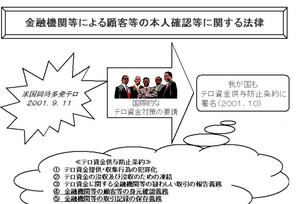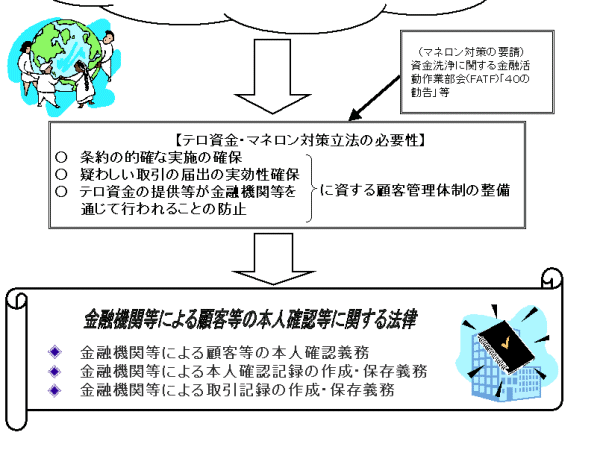 .法律の目的 本法律の目的は、金融機関等による顧客等の本人確認及び取引記録の保存に関する措置を定めることにより、(a)テロ資金供与防止条約の的確な実施を確保することに加え、(b)テロ資金やマネー・ローンダリングに関する疑わしい取引の届出(注2)の実効性を確保し、かつ、(c)捜査機関による効率的な資金トレースを可能にすること等によりテロ資金の提供(注3)やマネー・ローンダリングが金融機関等を通じて行われることを防止するための金融機関等の顧客管理体制の整備の促進を図ることである。 |