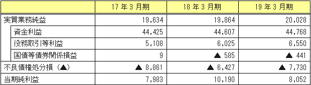 19年3月期の決算は、実質業務純益は、貸出金の増加や役務取引等利益の増加はあるものの、預金金利の引き上げが貸出金利の引き上げに先行し利鞘が減少していること等から、ほぼ横ばい。