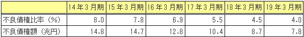19年3月期の不良債権比率は、引き続き低下し、4.0%となった。これはピーク時の半分以下の水準であり、着実に改善。