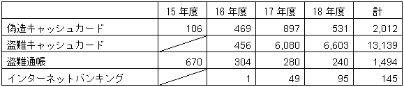 | (注1) | 偽造キャッシュカード被害発生件数及び平均被害額の合計には、12年度(1件)及び14年度(8件)の件数・金額を含む。 |
