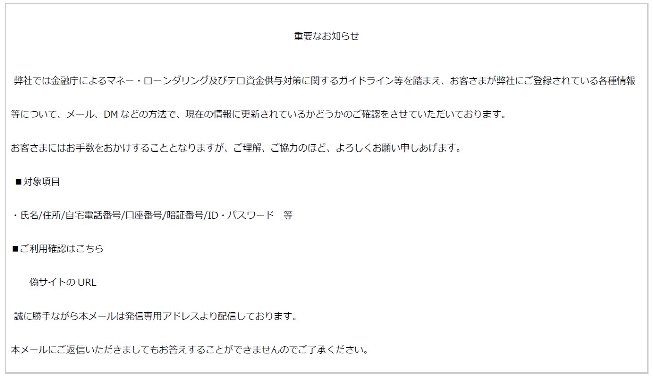 金融機関のマネロン等対策を騙ったフィッシングメールに