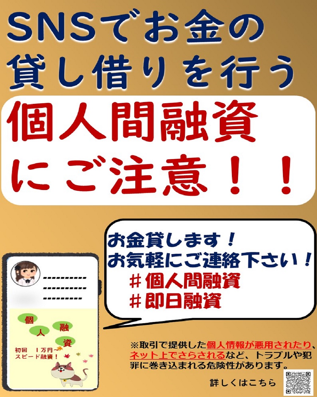 SNSやインターネット掲示板などにおいて、個人間での金銭の貸し借りをうたった書き込みがなされている実態があります。