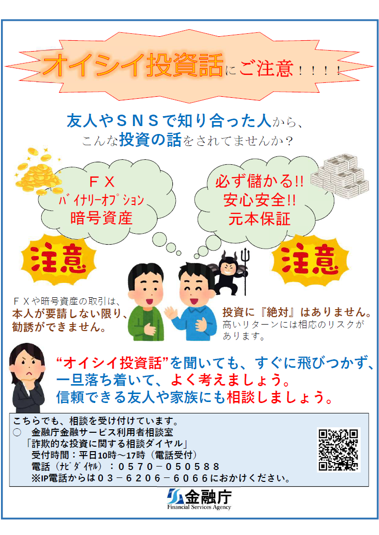 - ■“オイシイ投資話”がきても、すぐに飛びつかず、一度、ゆっくり、しっかり考えて、慎重・冷静に判断してください。