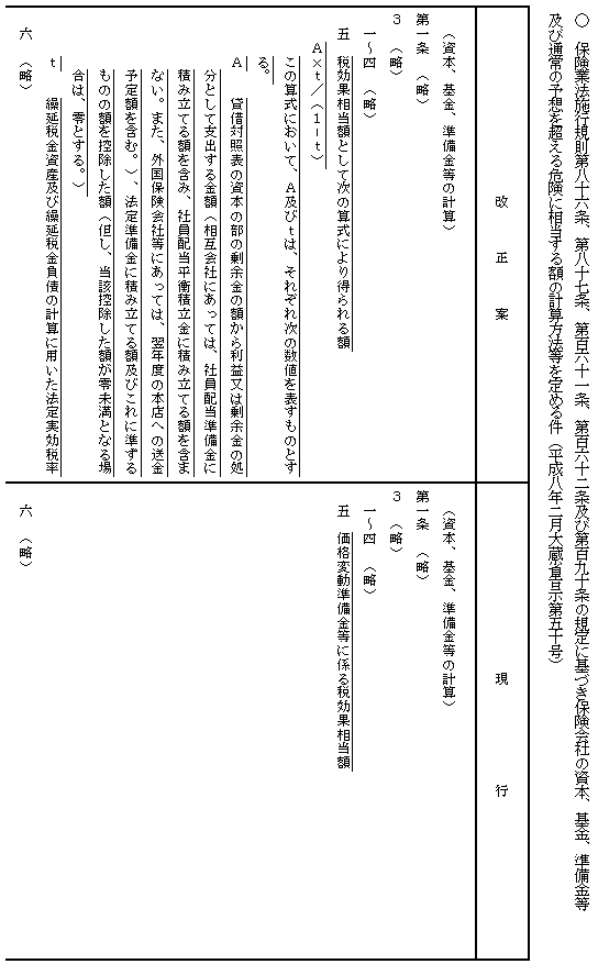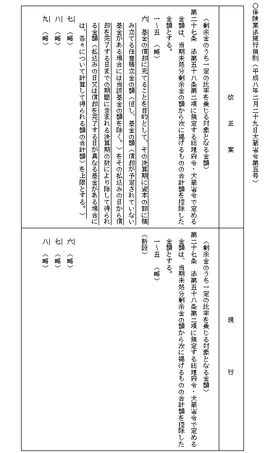 保険会社の財務の健全性の確保を通じ、保険契約者等の保護を図る観点から、保険会社の財務面の監督上の措置について、別紙のとおり保険業法施行規則(総理府令・大蔵省令)及び告示の改正を行うことを検討しています(概要については別紙1、具体的な改正内容については別紙2をそれぞれ参照)。