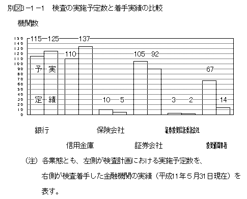 銀行については、金融再生トータルプランに盛り込まれたとおり、その資産内容等の実態把握のために、主要行・地方銀行・第二地方銀行に対し集中的に検査を実施したのに加え、一部の銀行についてはコンピュータ2000年問題に関する検査、内部モデルに関する検査等を集中検査とは別に実施したことから、検査計画に比べ着手件数は増加している。
