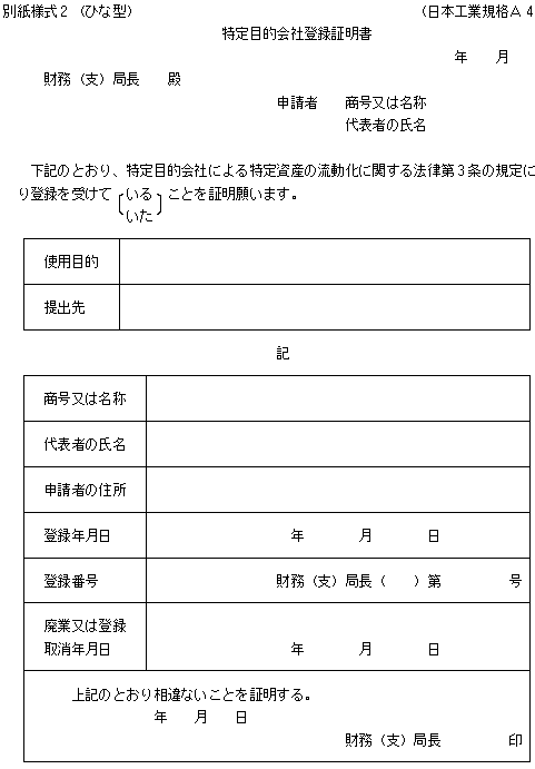 明の申請があったときは、別紙様式2により特定目的会社登録証明を行うものとする。