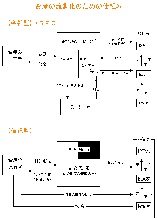 | SPC法を改正し、流動化対象資産を拡大するとともに、より使い勝手のよい制度に改める。また、流動化の器として信託も利用可能とする。 これに伴い法律名を「資産の流動化に関する法律」に改める。 |