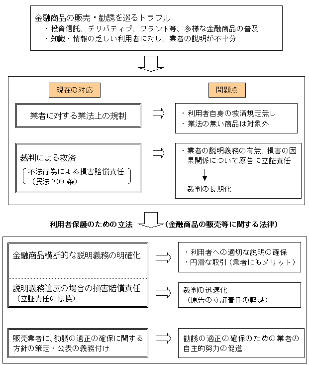 2)本法律によって、説明義務を法定し、原告(顧客)の因果関係の立証責任を転換することにより、原告の立証責任の軽減が図られることとなる。 なお、原告は、民法709条による損害賠償請求を行うことも可能。 |