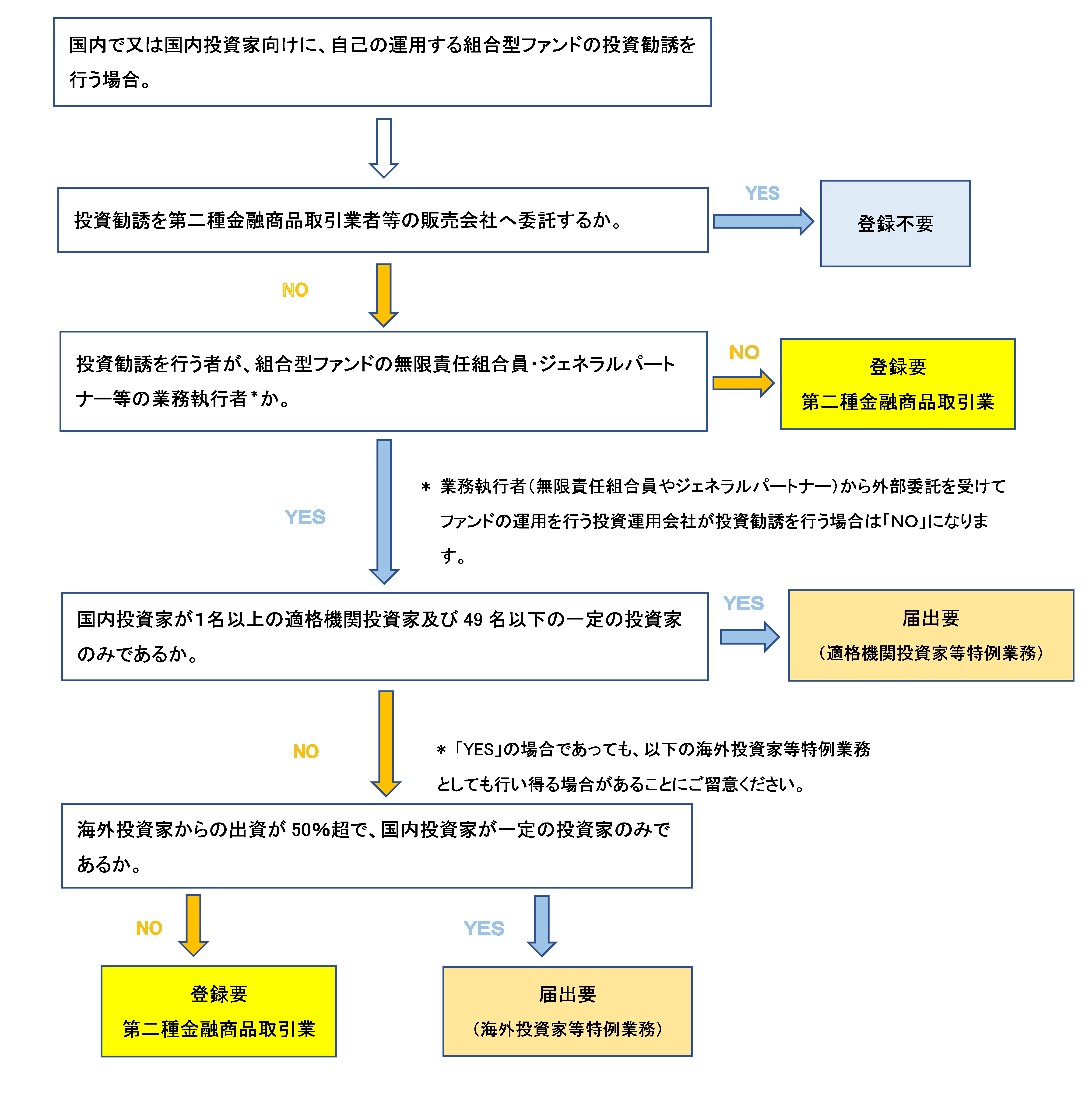 c.当該組合型ファンドの国内投資家が適格機関投資家及び49名以下の一定の投資家のみで、かつ、当該業務執行者が一定の事項について事前に当局に届出を行っている場合(法63条)