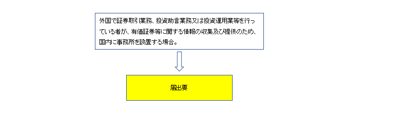 ・ 外国で証券取引業務、投資運用業又は投資助言業務を行う外国金融機関(X)が、有価証券市場等に関する情報収集・情報提供(マーケティング・セミナーの開催など、投資助言業務や特定の金融商品の勧誘とならない程度の情報提供を含みます)を行うため国内に駐在員事務所等の施設を設置する場合は、事前の届出が必要となります(法62条)。