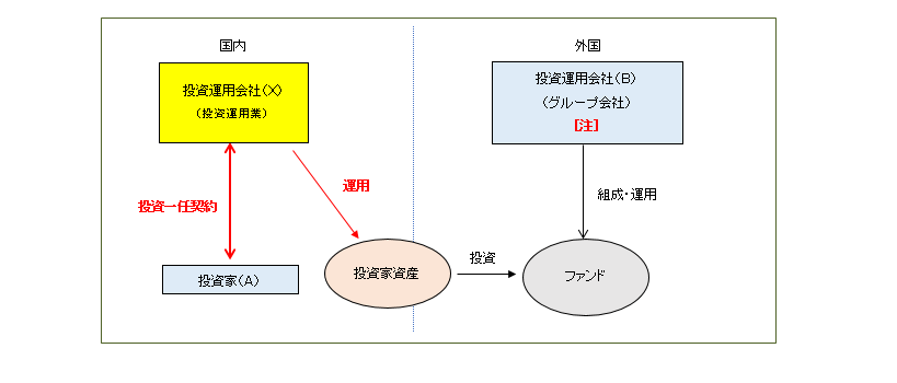 (ⅰ) 国内に拠点を置く投資運用会社が、国内投資家から資産運用を受託するとともに、その運用業務を、外国のグループ会社等に再委託する場合