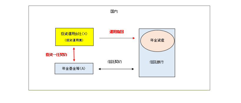 国内に拠点を置く投資運用会社(X)が、年金基金等(A)との間で投資一任契約を締結し、同契約に基づき年金基金等(A)の保有資産の運用を行う場合。