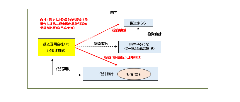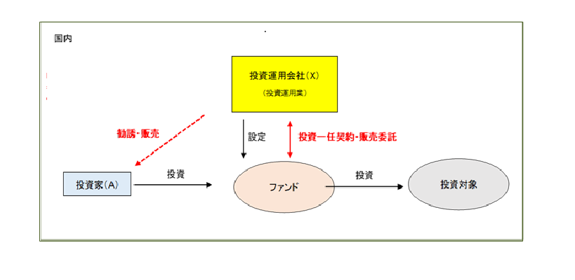 国内に拠点を置く投資運用会社(X)が、国内において投資信託を設定・運用するとともに、自ら設定した当該投資信託への投資を投資家(A)に勧誘する場合。