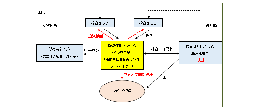 国内に拠点を置く投資運用会社(X)が、国内において、組合型ファンドを組成し、その投資家(A)から出資を受けた金銭を運用(自己運用)するとともに、自ら当該ファンド持分を投資家(A)に勧誘する場合。