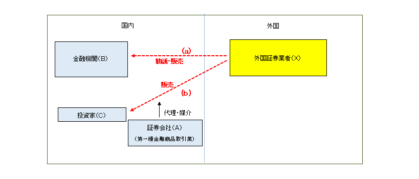 (a) 外国証券業者(X)が、(ⅰ)国内において有価証券関連業を行う金融商品取引業者である金融機関(B)に対して勧誘を行う場合(法58条の2但書)、及び(ⅱ)銀行・保険会社・投資運用業者等の金融機関(B)に対し、それらの自己投資活動や運用業務に関して、外国から勧誘を行う場合(令17条の3第1号) (⇒ (参考1)(2)①参照)