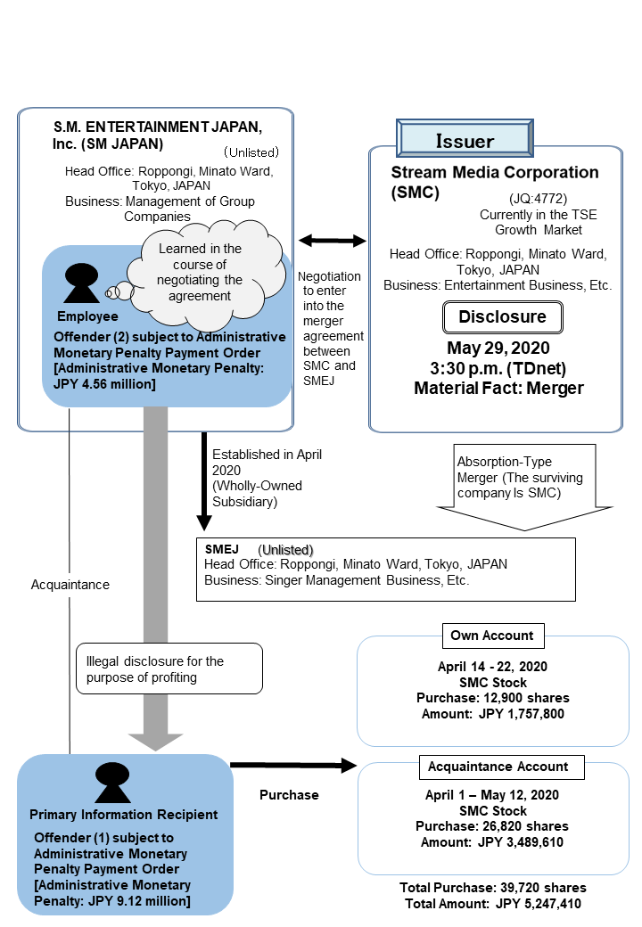 Offender (1), who is subject to an administrative monetary payment order, was informed by an employee of S.M.ENTERTAINMENT JAPAN. (“SM JAPAN”) about material non-public information (hereinafter “MNPI”) regarding the decision maker of SMC, who had decided that it would merge with SMEJ, a subsidiary newly established by SM JAPAN. The employee, who is Offender (2) described below, learned about the MNPI regarding the merger during the course of negotiations for the merger agreement between SMEJ and SMC.