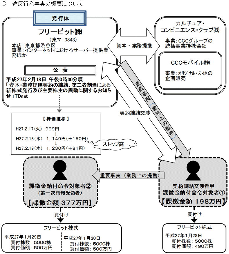 課徴金納付命令対象者(1)は、フリービット株式会社(以下「FB」という。)と課徴金納付命令対象者(1)との間で行っていた、同社のモバイル事業への課徴金納付命令対象者(1)等の参画を内容とするマーケティングコンサルティング業務委託契約、雇用契約及び新株予約権割当契約締結の交渉に関し、FBの業務執行を決定する機関がカルチュア・コンビニエンス・クラブ株式会社及びCCCモバイル株式会社(平成27年12月11日商号変更によりCCCモバイルホールディングス株式会社。)と業務上の提携を行うことについての決定をした旨の重要事実を知りながら、上記重要事実の公表がされた平成27年2月18日より前の同年1月28日、自己の計算において、FB株式合計5000株を買付価額合計490万円で買い付けたものである。