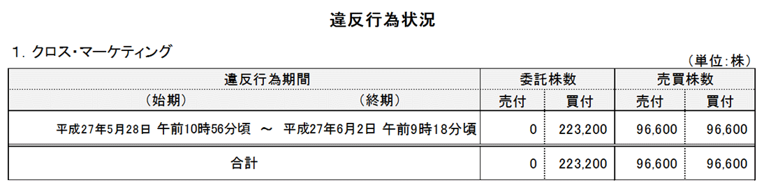 (1)当該違反行為に係る自己の計算による有価証券の売付け等の数量は、96,600株であり、当該違反行為に係る自己の計算による有価証券の買付け等の数量は、96,600株であることから、