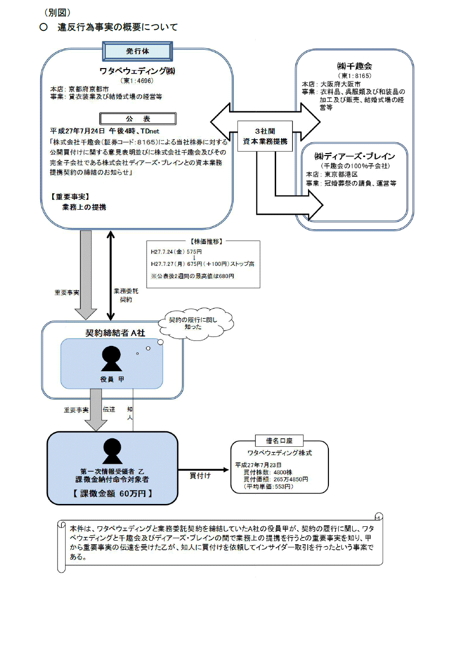 課徴金納付命令対象者は、ワタベウェディング株式会社(以下「ワタベ」という。)と業務委託契約を締結していたA社の役員甲から、同人が同社とワタベとの業務委託契約の履行に関し知った、ワタベの業務執行を決定する機関が、株式会社千趣会及び株式会社ディアーズ・ブレインと業務上の提携を行うことについての決定をした旨の重要事実の伝達を受けながら、上記重要事実の公表がされた平成27年7月24日より前の同月23日、自己の計算において、ワタベ株式合計4800株を買付価額合計265万4850円で買い付けたものである。