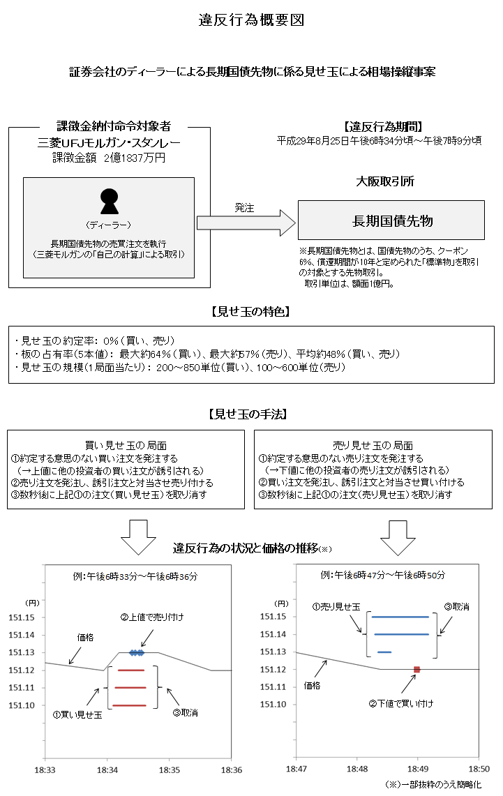 三菱UFJモルガン・スタンレーは、第一種金融商品取引業を行うことにつき関東財務局長の登録を受けている株式会社であるが、同社のディーリング業務に従事していた者において、同社の業務に関し、株式会社大阪取引所(以下「大阪取引所」という。)に上場されていた長期国債先物2017年9月限月(以下「本件国債先物」という。)について、市場デリバティブ取引を誘引する目的をもって、別表記載のとおり、平成29年8月25日午後6時34分頃から同日午後7時9分頃までの間、大阪取引所において、約定させる意思がないのに、最良買い気配値以下の価格に多数の買い注文を発注する方法により、合計6253単位の買付けの申込みを行うとともに、合計177単位を売り付ける一方、最良売り気配値以上の価格に多数の売り注文を発注する方法により、合計1844単位の売付けの申込みを行うとともに、合計158単位を買い付けるなどし、もって、自己の計算において、市場デリバティブ取引が繁盛であると誤解させ、かつ、大阪取引所における本件国債先物の相場を変動させるべき一連の市場デリバティブ取引及び申込みをしたものである。