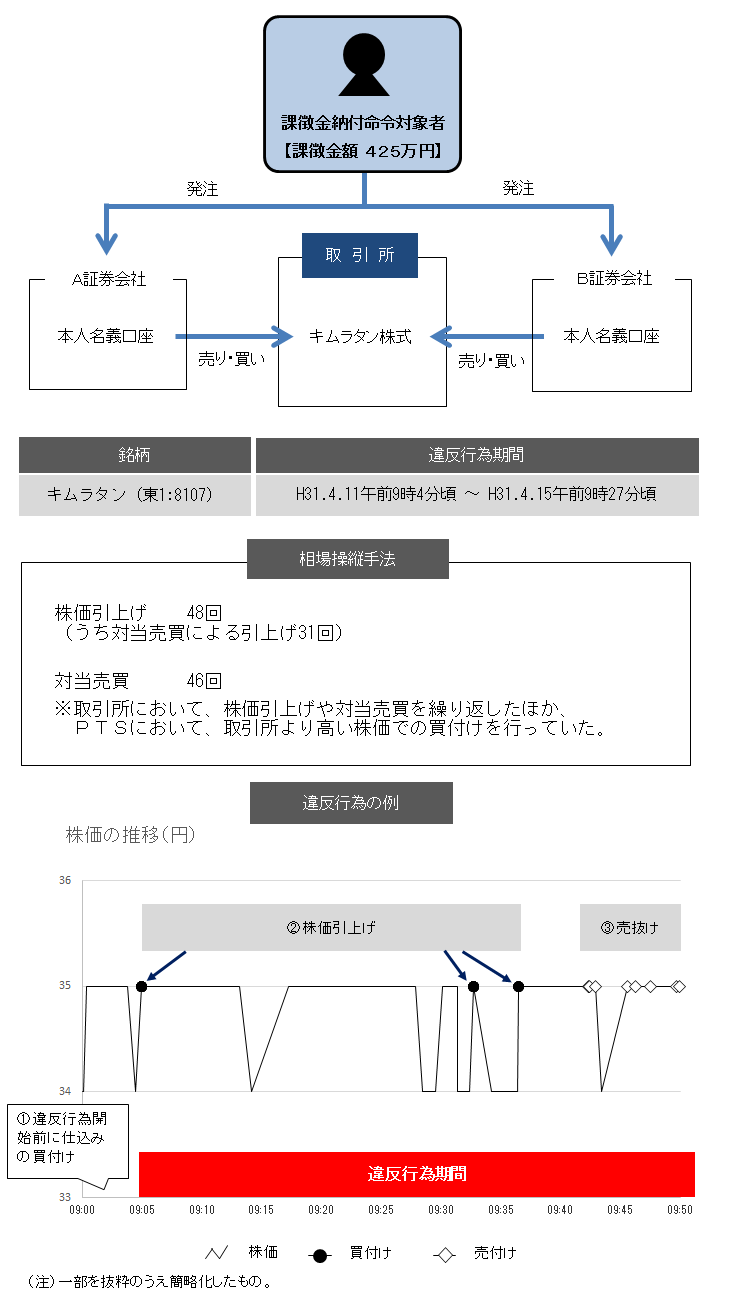 課徴金納付命令対象者は、株式会社キムラタンの株式につき、同株式の売買を誘引する目的をもって、別表記載のとおり、平成31年4月11日午前9時4分頃から同月15日午前9時27分頃までの間、3取引日にわたり、成行または指値の買い注文を発注して、他の投資者が発注した売り注文を買い付けることにより直前の約定値より株価を引き上げたり、自身が発注した売り注文に成行または指値の買い注文を対当させて買い付けることにより直前の約定値より株価を引き上げたりするなどの方法により、同株式合計91万1200株を買い付ける一方、同株式合計82万4100株を売り付け、もって、自己の計算において、同株式の売買が繁盛であると誤解させ、かつ、同株式の相場を変動させるべき一連の売買をしたものである。