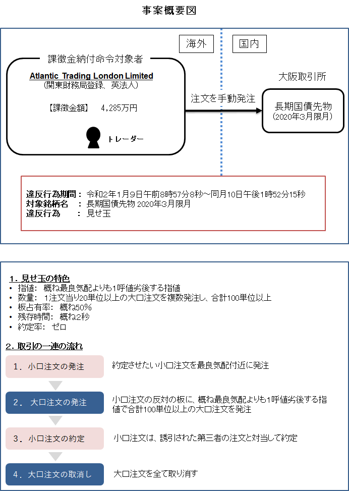 アトランティック・トレーディング・ロンドン・リミテッドは、高速取引行為を行うことにつき関東財務局の登録を受けた英国法人であるが、同社の自己勘定での金融商品取引等に従事していたトレーダーにおける手動取引により、同社の業務に関し、株式会社大阪取引所(以下「大阪取引所」という。)に上場されていた長期国債先物2020年3月限月について、その売買を誘引する目的をもって、別表記載のとおり、令和2年1月9日午前8時57分8秒頃から同月10日午後1時52分15秒頃までの間、大阪取引所において、最良売り気配よりも劣後する価格に約定させる意図のない多数の売り注文を発注する方法、又は、最良買い気配あるいはこれに劣後する価格に約定させる意図のない多数の買い注文を発注する方法により、合計380枚の売付けの委託を行うとともに合計12枚を買い付ける一方、合計520枚の買付けの委託を行うとともに合計23枚を売り付けるなどし、もって、自己の計算において、同先物の売買が繁盛であると誤解させ、かつ、大阪取引所における同先物の相場を変動させるべき一連の市場デリバティブ取引及びその委託をしたものである。