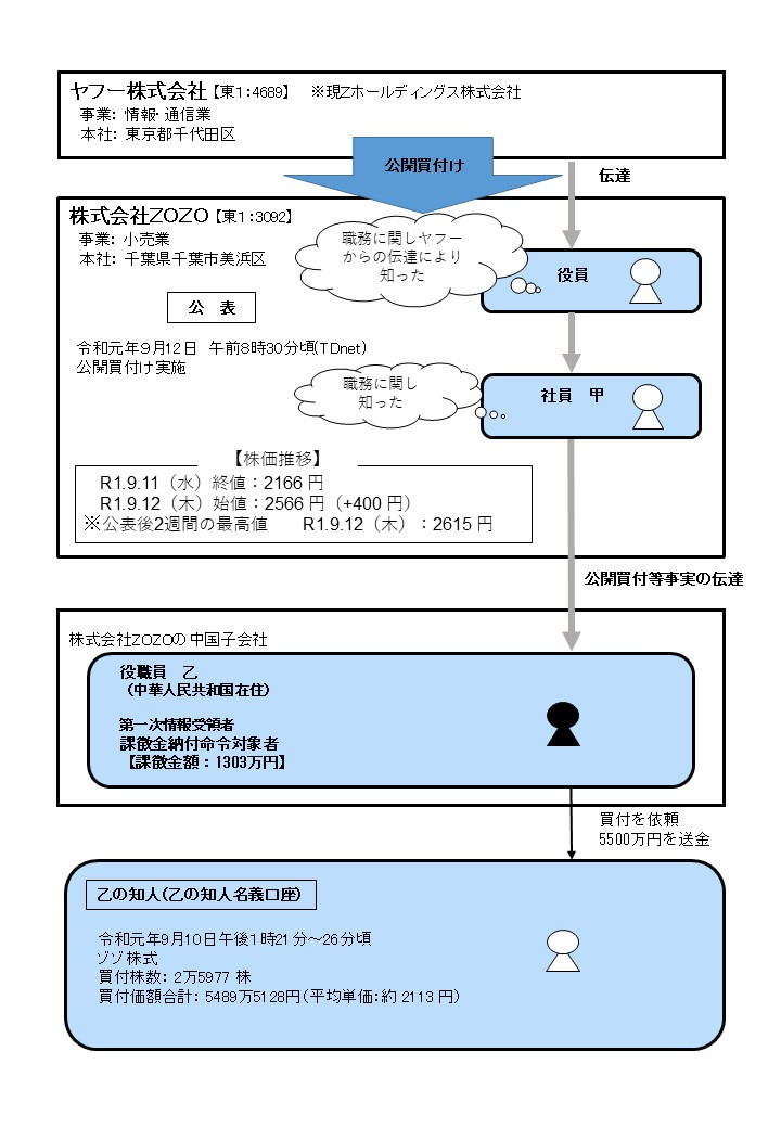 課徴金納付命令対象者(中国居住)は、ゾゾの中国子会社の役職員であるが、ゾゾ社員であった甲から、同人がその職務に関し知った、ゾゾの役員がその職務に関しヤフー株式会社(現Zホールディングス株式会社)からの伝達により知った同社の業務執行を決定する機関がゾゾ株式の公開買付けを行うことについての決定をした旨の公開買付けの実施に関する事実の伝達を受けながら、当該事実の公表がされた令和元年9月12日より前の同月10日、自己の計算において、ゾゾ株式合計2万5977株を買付価額合計5489万5128円で買い付けたものである。